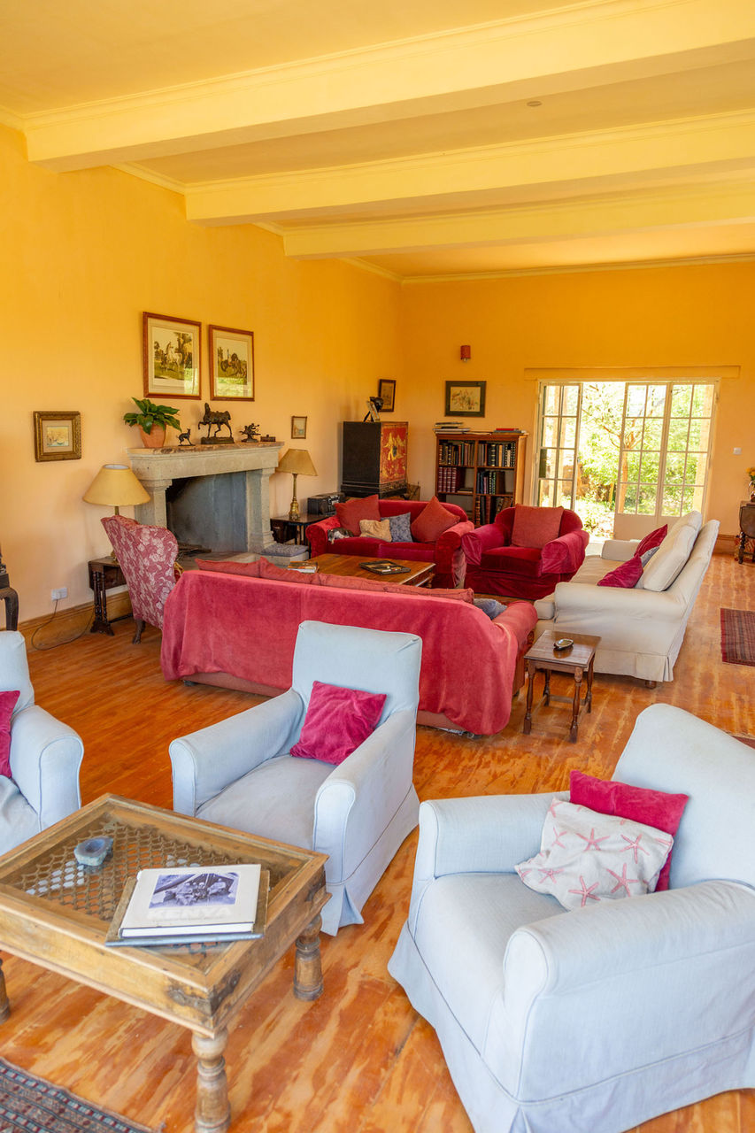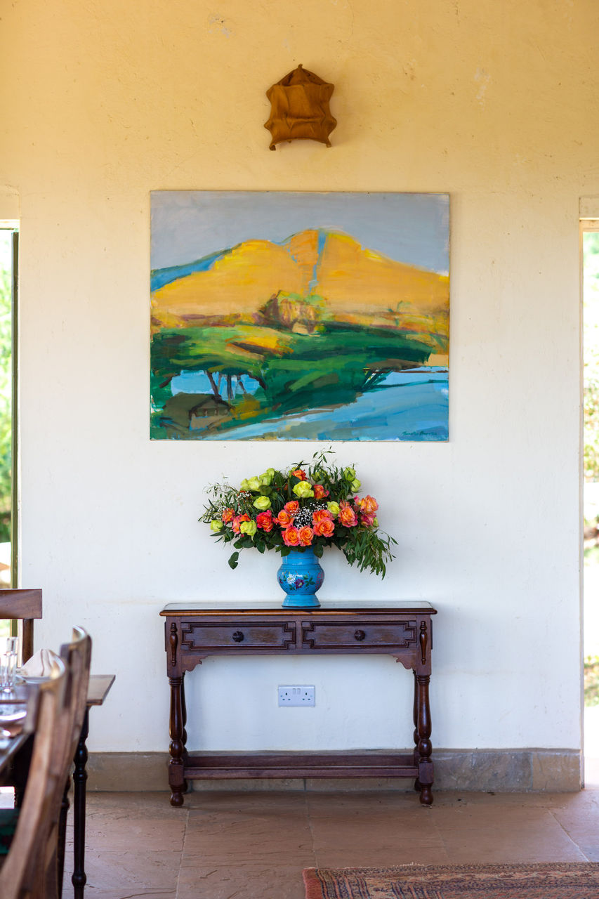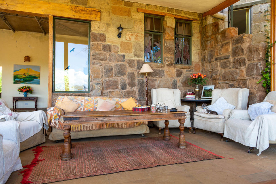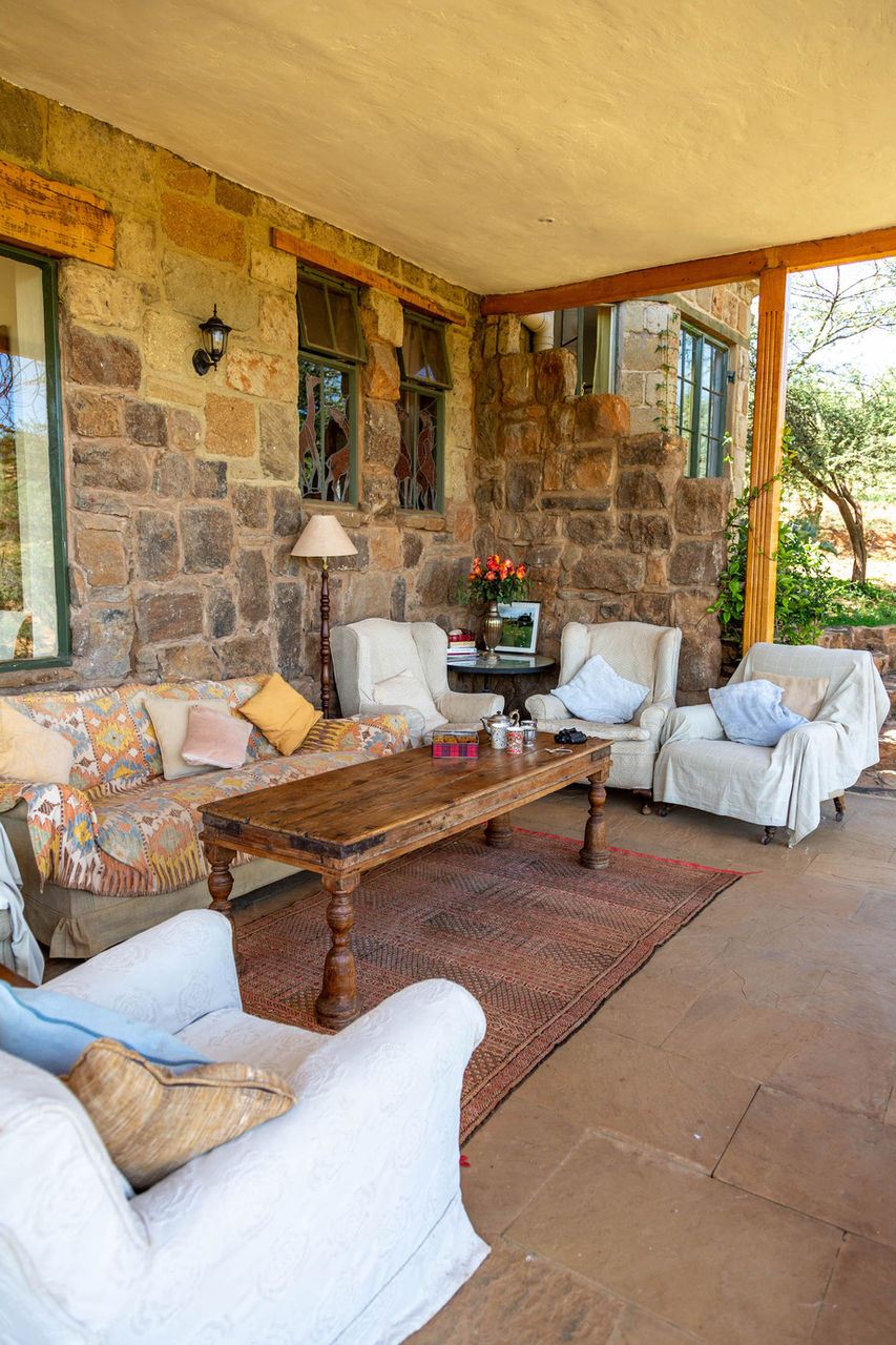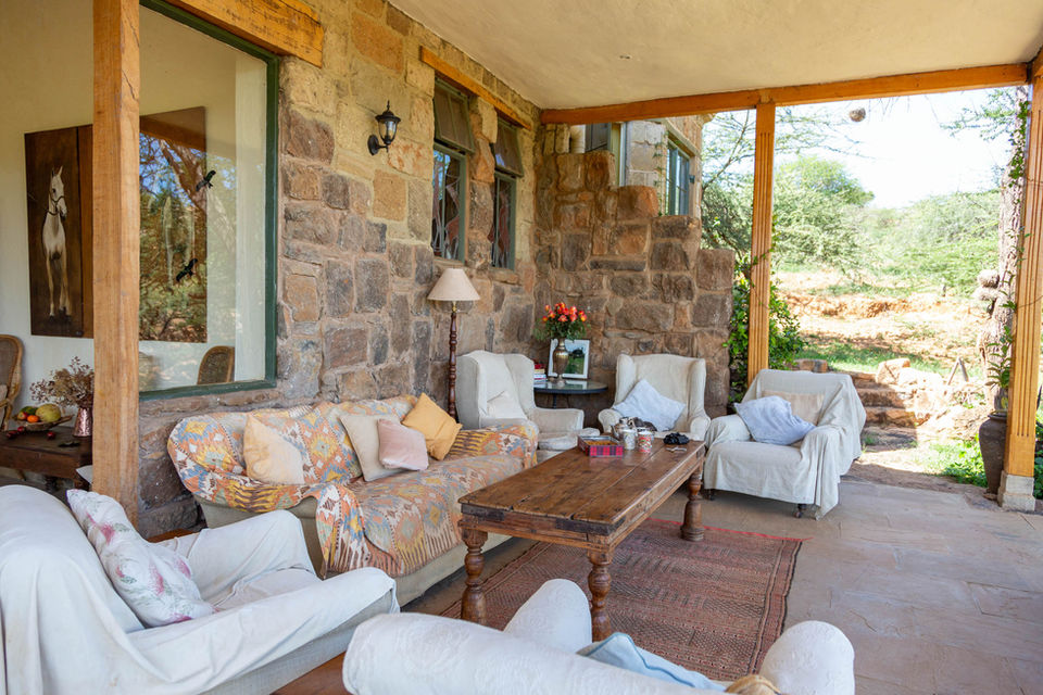 As this is a very dry area, we needed a house with a huge roof surface - to collect rain water - and so the idea of a large courtyard garden surrounded by a rough oval of connected buildings came into being. We also obviously needed a croquet lawn, so that had to be enclosed as well. The idea was to create a great big comfortable home that would simply disappear into the original untouched, rugged landscape. Even now, as the trees continue to grow, the house becomes less visible. And it’s becoming more of a home too as we bring up more things from our previous house. The sitting room is filling up with framed photos and some wonderful old family bronzes – mainly of horses and dogs. We love paintings and you will find quite a collection of different styles – from delicate flower prints of Mouse's grandmother's, to huge oil paintings by Timothy Brooke, a great friend and one of Kenya’s most talented artists.